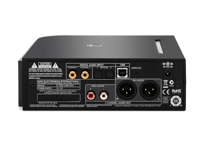 As entradas digitais do D 1050 permitem a ligação de diferentes fontes digitais com saídas SPDIF coaxiais e ópticas. A entrada USB é muito especial — o seu modo de operação assíncrono usa um relógio de alta precisão para controlar a saída do dispositivo USB a ela ligado para o menor jitter possível e utiliza o USB Audio Codec 2.0 que permite a transmissão do sinal a 192kHz.