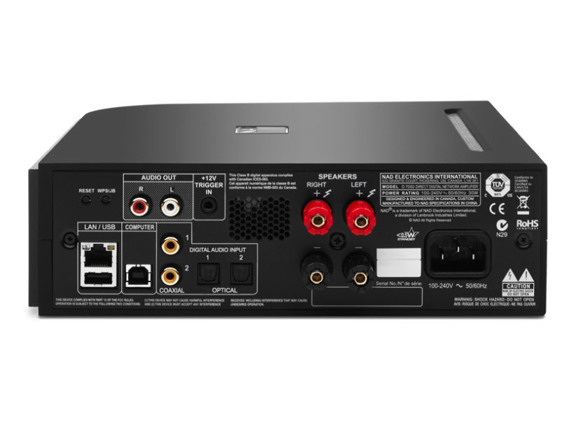 O D 7050 utiliza a mais avançada plataforma digital direta da NAD, introduzida no premiado amplificador Masters Series M2. O sistema Direct Digital elimina qualquer ruído e distorção produzidos por circuitos analógicos, já que no D 7050 a música vai diretamente em digital até às saídas para as colunas. A tecnologia Direct Digital executa todas as funções de pré-amplificação no domínio digital usando um software sofisticado para controlar todos os aspetos do desempenho. O Digital é convertido para analógico por um filtro de reconstrução passivo simples localizado nas saídas para as colunas e que compara o sinal de entrada com a saída, compensando qualquer diferença para alcançar um resultado ‘perfeito’.