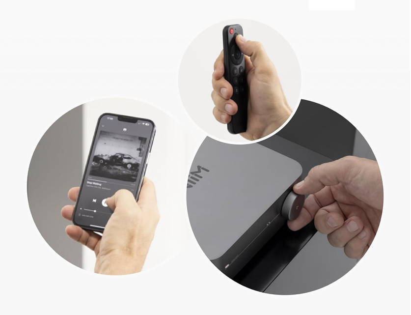 O WiiM Amp atende aqueles que procuram otimizar sistemas de áudio que adoram, com décadas e de alta qualidade ou aqueles que procuram usar as suas colunas passivas clássicas com as suas plataformas favoritas, sem esforço. Ao ligar facilmente o seu equipamento de áudio ao WiiM Amp, pode controlar a sua preferência de streaming a partir do conforto da aplicação WiiM Home. O controlo remoto por voz WiiM oferece conforto e outra alternativa aos controlos sem fios para o WiiM Amp.